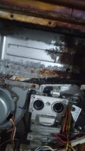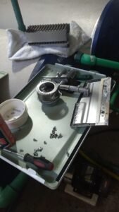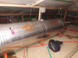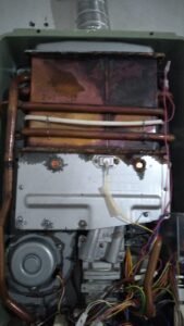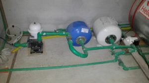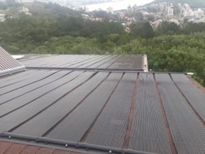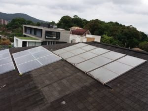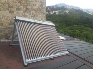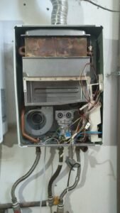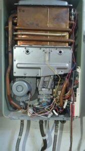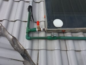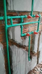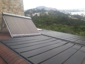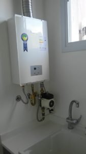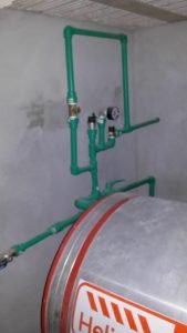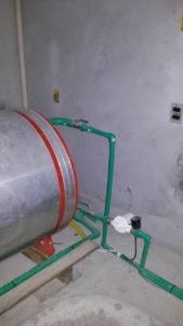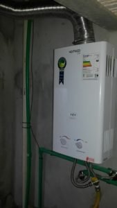 Sistema de água quente nós chuveiros com aquecedor a gás.